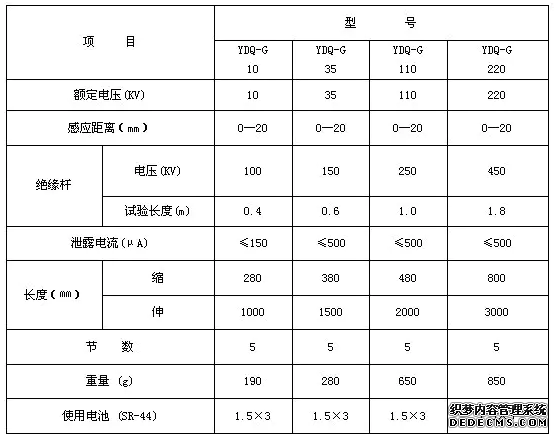 感应交声光验电器是一种携带方便、重量轻、验电方便的新型验电器。验电器适用于额定频率为50HZ,电压等级为10KV、20KV、35KV、110KV、220KV、500KV作直接接触式或非接触式验电用。验电器适用于发电、输电、变电系统和工矿企业的电器操作检修人员用于验证有无电压的理想**工具使用环境温度为-25-55;相对湿度为20%~96%,使用场合为户内和户外良好天气.指示器工作电源为四节SR44(AG13)纽扣电池,静态电<=10Ua,测电寿命>=5000次.